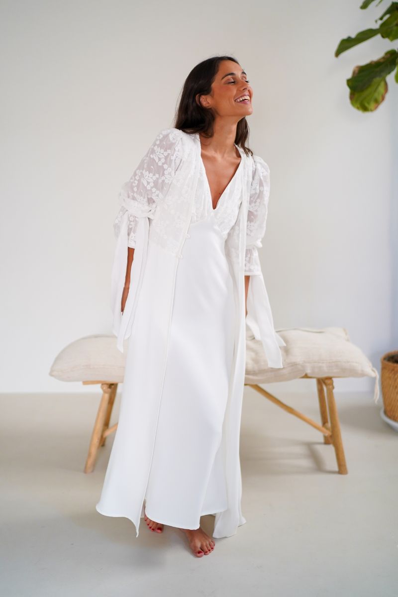 La noche antes de los preparativos para una boda es un momento crucial para relajarte y prepararte mentalmente para el gran día. La comodidad juega un papel fundamental durante esta fase, por lo que elegir el pijama y la bataadecuados es esencial. Opta por prendas que sean suaves y cómodas, permitiéndote moverse con facilidad mientras te preparas para el evento. Las batas de seda o de algodón pueden ser perfectas para esto, ya que ofrecen elegancia y confort al mismo tiempo, sin interferir con el proceso de maquillaje y peinado. Nuestra Bata Simone es una bata color blanco de lino con un corte en la cintura y se abrocha con un botón interior. La elección de pijamas que te proporcionen una buena noche de sueño también es fundamental, para asegurarte de estar descansada y lista para el día de tu boda. El Pijama Jane Blanco es un pijama de dos piezas con un color blanco ideal para el verano. Detalle con lazo de terciopelo autoajustable.