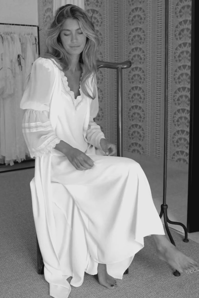 La Bata Renata está confeccionada en crepe de color blanco, con mangas de gasa abullonada y encajes de algodón de color blanco y beige. Escote en forma de pico y cierre con dos corchetes interiores que hace que se adapte perfectamente a su cintura. No se puede bordar. Si dudas entre dos tallas recomendamos la mayor. Puedes combinarla con el camisón Renata y crear un total look o encontrar más opciones en nuestro apartado camisones.
