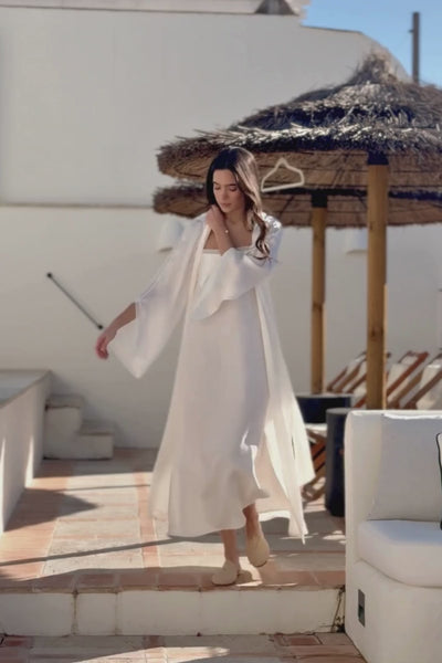 El Conjunto Laurence está formado por una bata y un camisón. La Bata Laurence está confeccionada en raso plisado, con mangas anchas al estilo japonés. Se abrocha con una lazada del mismo tejido que hace que te sientas muy cómoda.